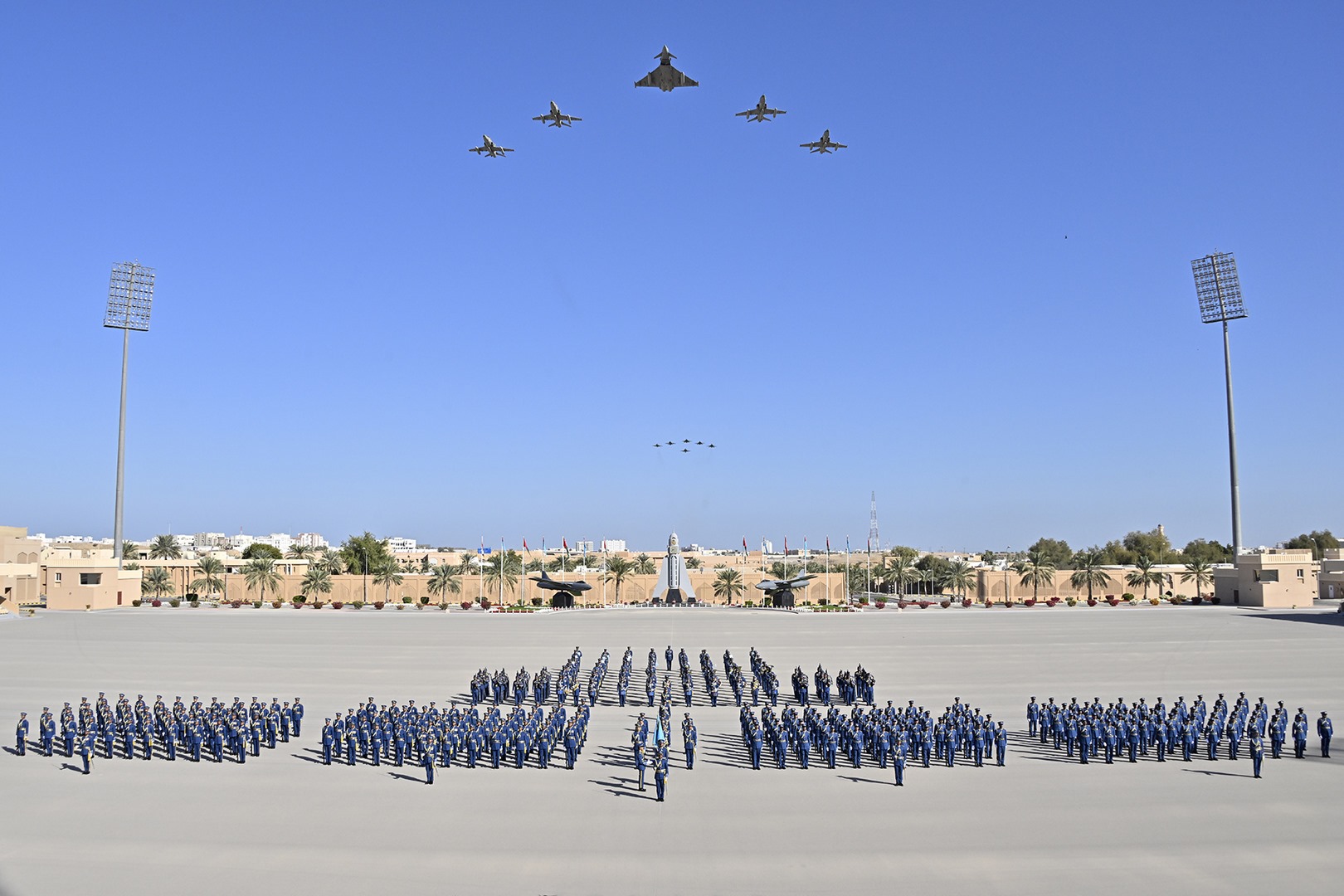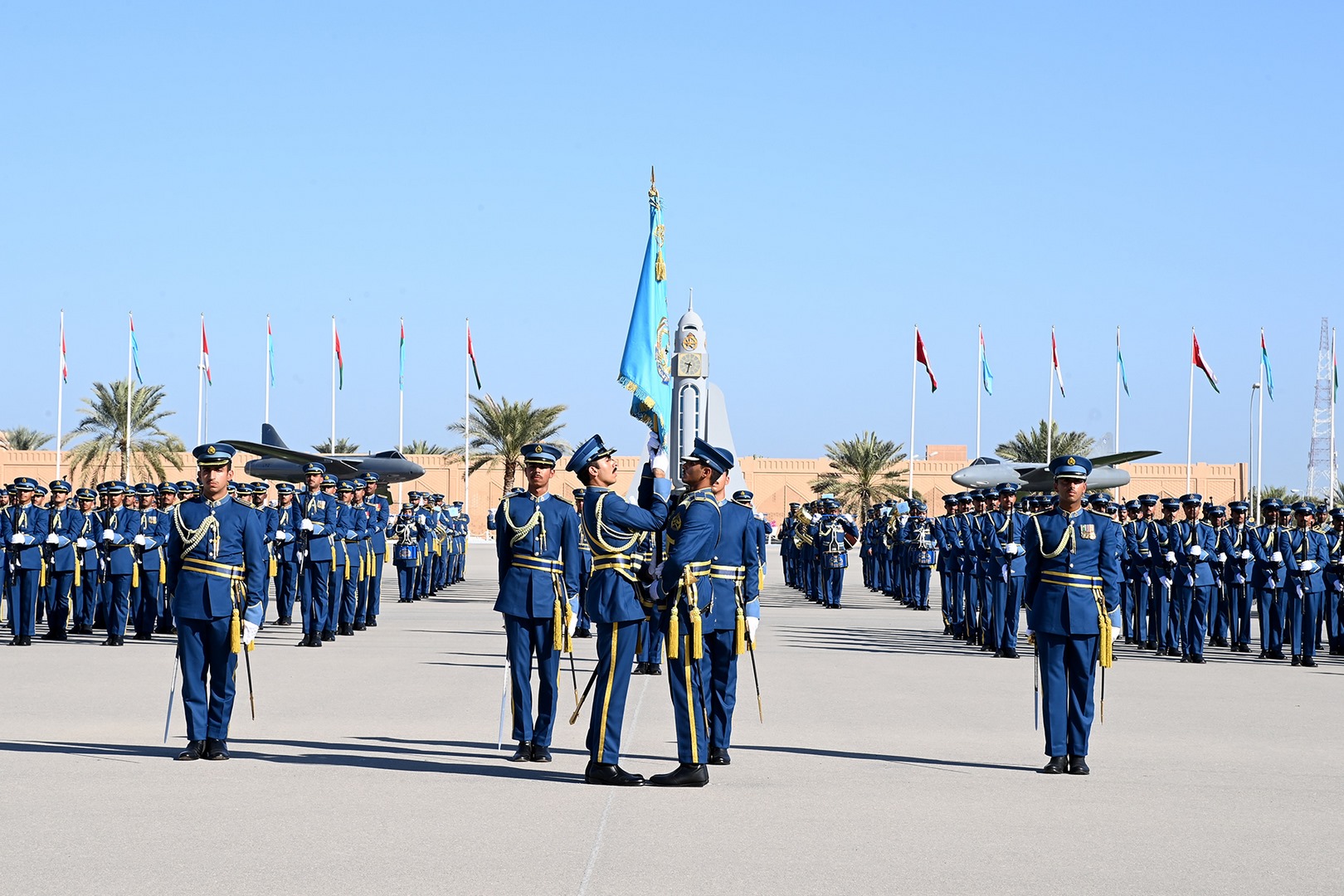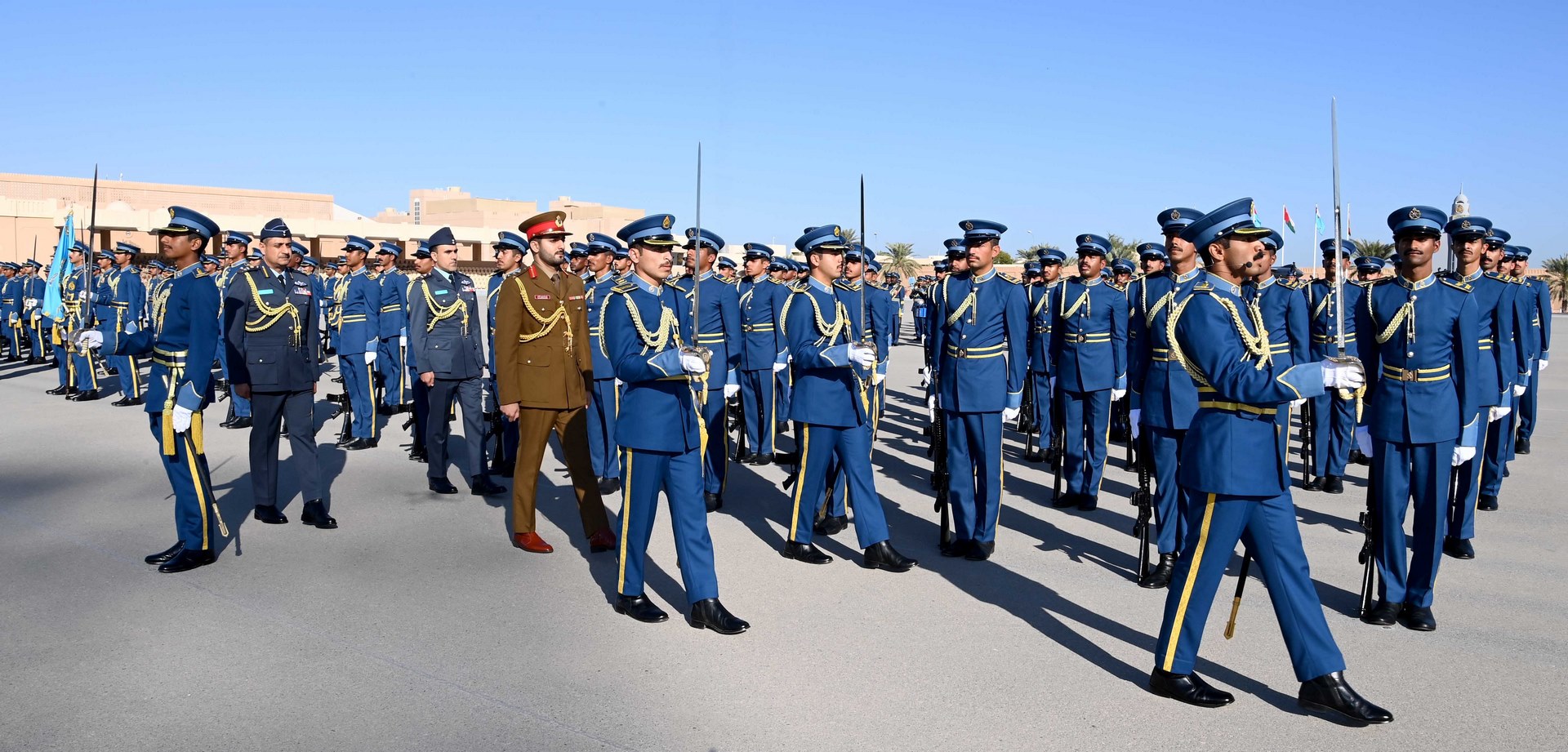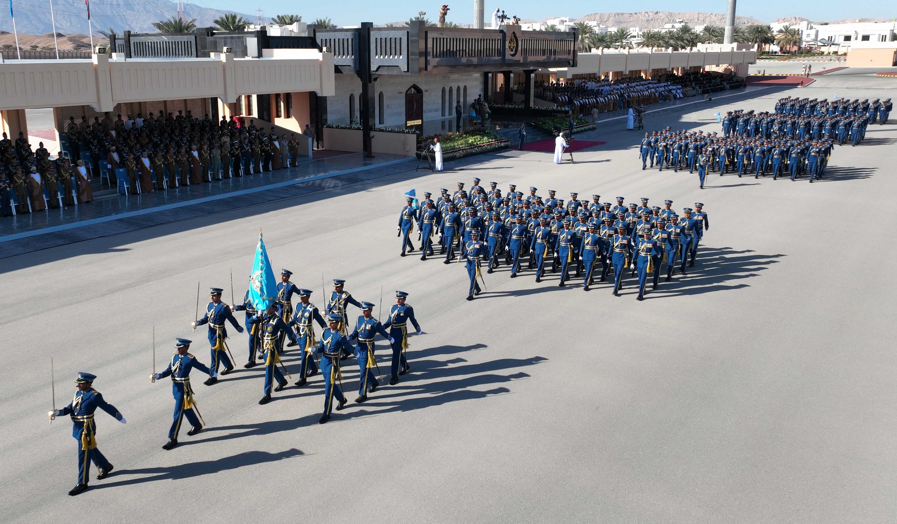ثم جرت مراسم تسليم وتسلم راية أكاديمية السلطان قابوس الجوية من الدورة المتخرجة إلى الدورة التي تتلقى تدريبها حاليا بأكاديمية السلطان قابوس الجوية، والتي أقسم منتسبوها على صونها والمحافظة عليها، ثم أنشد الضباط الخريجون نشيد سلاح الجو السلطاني العُماني، وأدوا قسم الولاء ونداء التأييد، وهتفوا ثلاثا بحياة حضرة صاحب الجلالة السلطان هيثم بن طارق المعظم القائد الأعلى ـ حفظه الله ورعاه ـ ثم قدمت عدد من الطائرات المقاتلة بسلاح الجو السلطاني العُماني استعراضا جوياً في سماء ميدان الاحتفال تجسيدًا لما تحقق لسلاح الجو السلطاني العُماني من تحديث وتطوير في قدراته التسليحية والتدريبية والبشرية، وما يحظى به من رعاية واهتمام ساميين من لدن مولانا حضرة صاحب الجلالة السلطان هيثم بن طارق المعظم القائد الأعلى -حفظه الله -، بعدها عزفت فرقة الموسيقى السلام السلطاني.