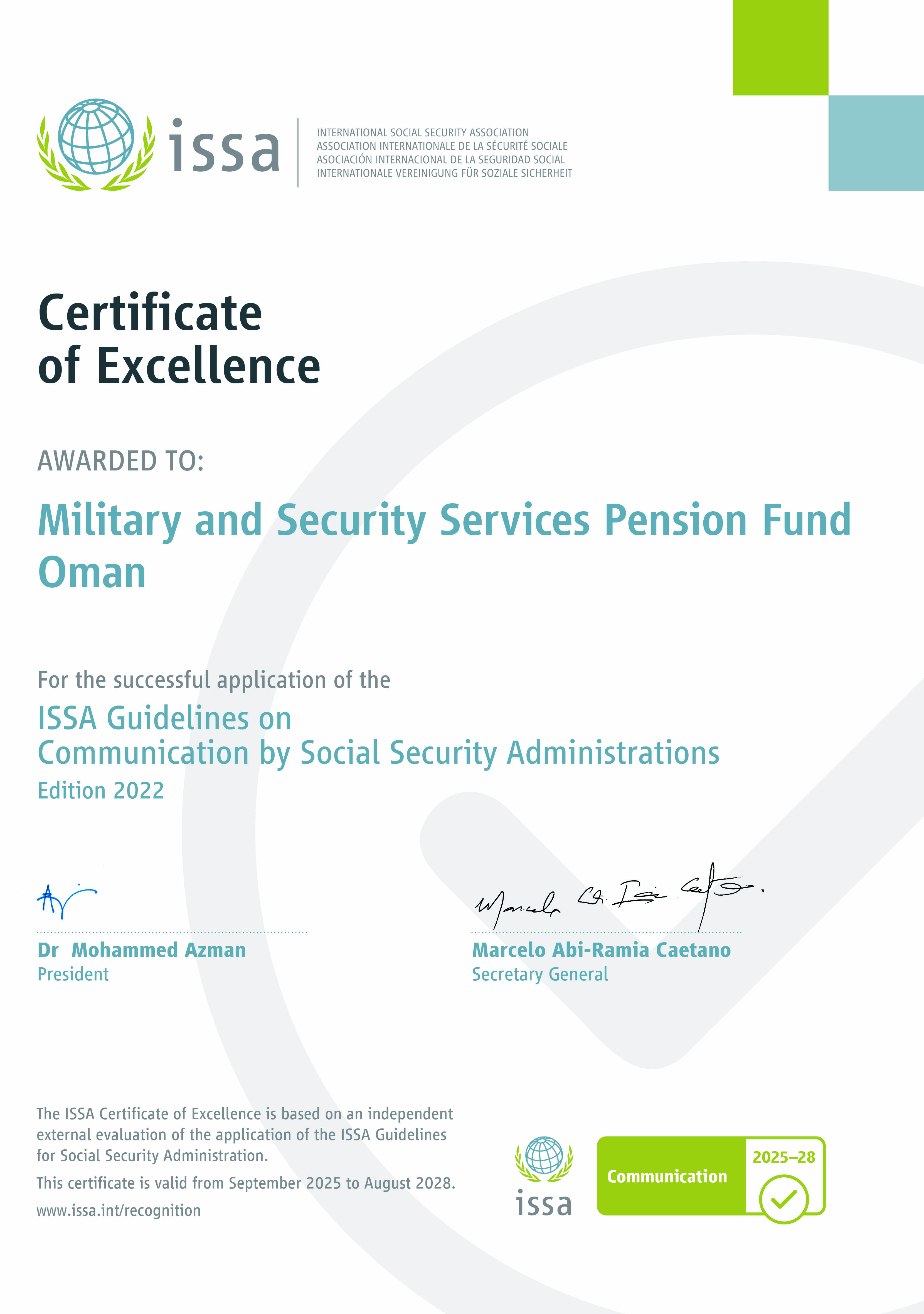 حصل صندوق تقاعد الأجهزة العسكرية والأمنية على شهادة التميز في الاتصال المؤسسي من الجمعية الدولية للضمان الاجتماعي (ISSA)، وتأتي هذه الشهادة كاعتراف دولي بجودة الممارسات الاتصالية، وشهادة رسمية من هذه الجمعية العالمية على التزام الصندوق بالمبادئ التوجيهية للجمعية في الاتصال المؤسسي.