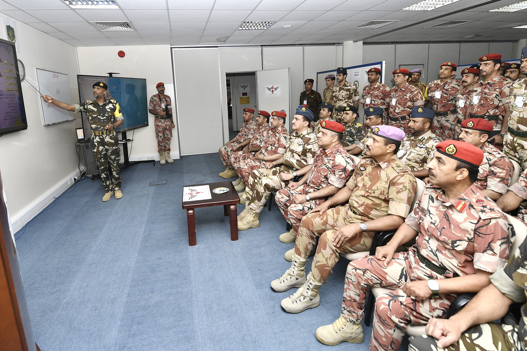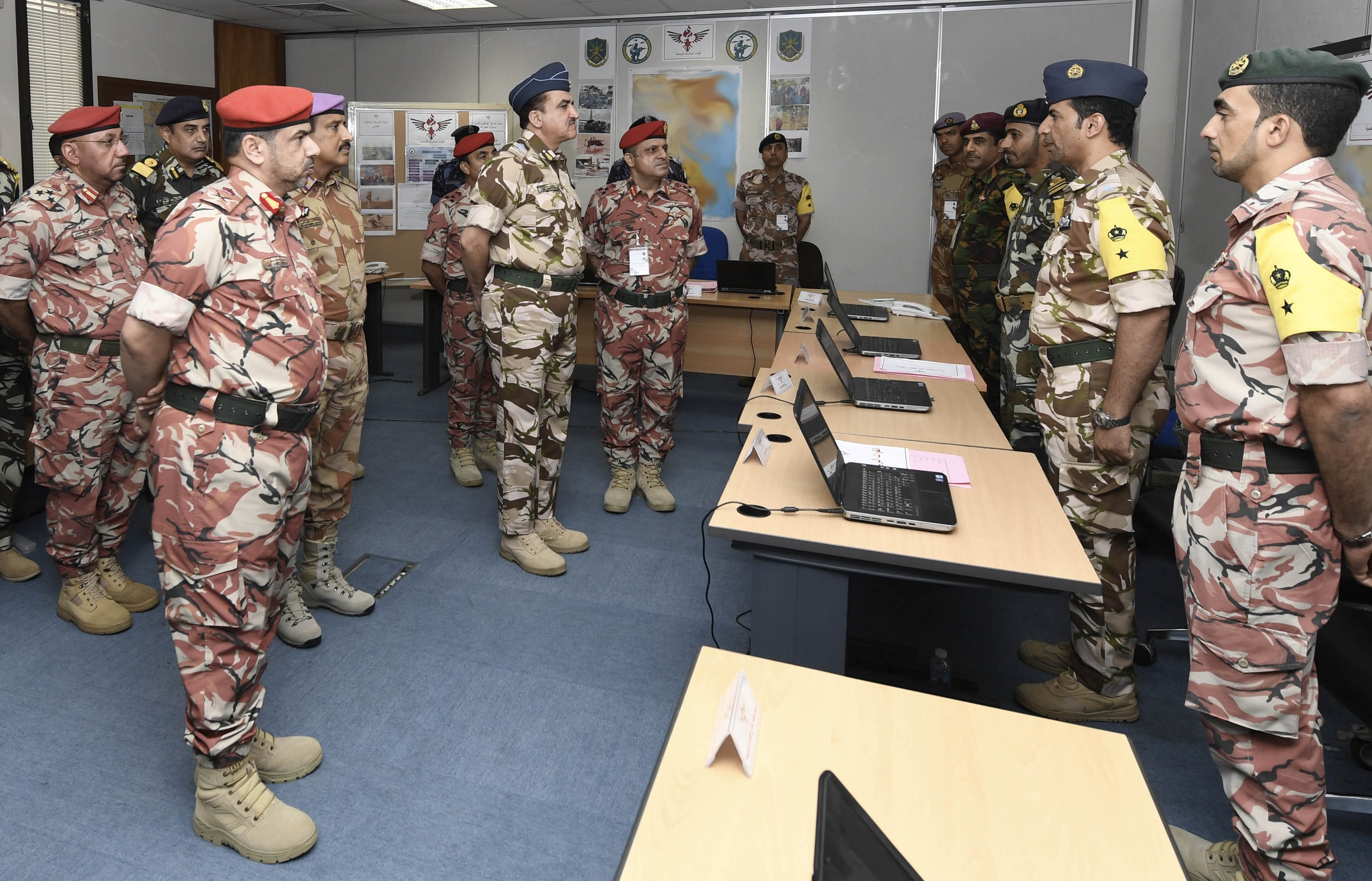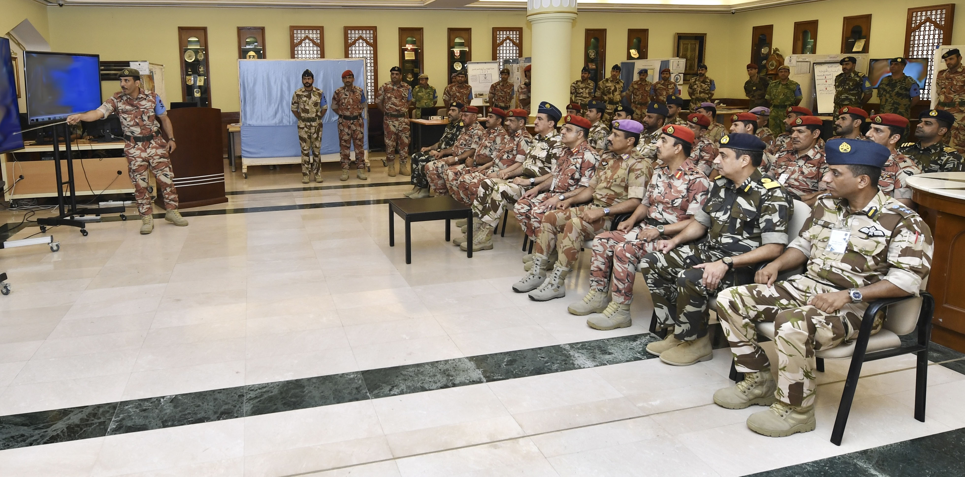 واستمع كل من قائد سلاح الجو السلطاني العماني وقائد قوة السلطان الخاصة وكبار الضباط إلى إيجاز عن سير مجريات التمرين، كما قدم الدارسون شرحا عن أحداث التمرين والحلول المناسبة للمعاضل المفترضة في مراحله المختلفة.