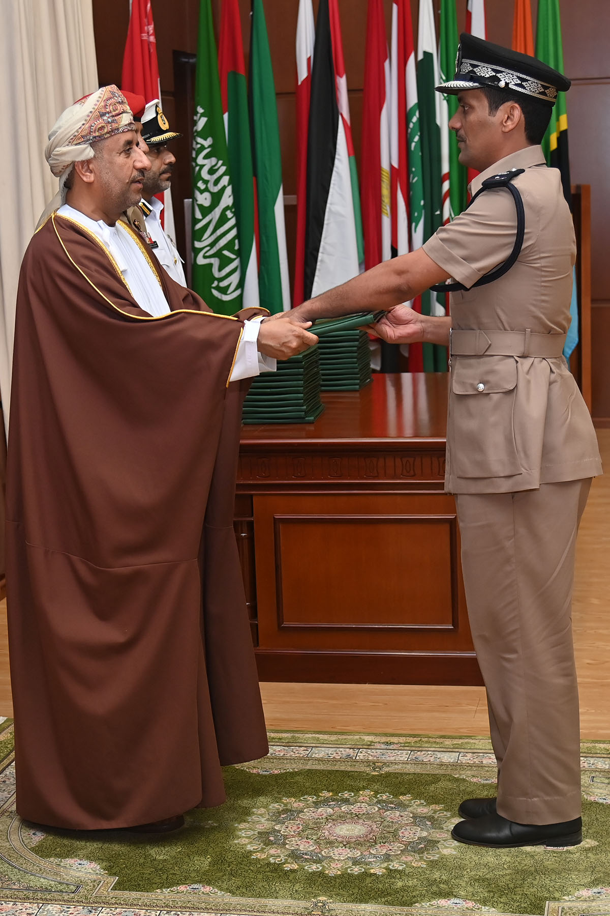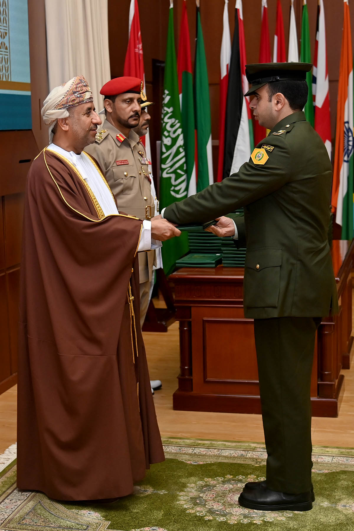 بعد ذلك سلَّم معالي الدكتور أمين عام وزارة الدفاع راعي المناسبة الجوائز للحاصلين على المراكز الأولى في الدورة والشهادات للخريجين، وقد حقق المركز الأول على المستوى العام للدورة الرائد الركن خليل بن سالم الوردي من جهاز الأمن الداخلي، وحصل على المركز الثاني الرائد الركن (مهندس) بدر بن سليمان المكتومي من الجيش السلطاني العُماني، وجاء الرائد الركن حسين بن عبدالله البريكي من سلاح الجو السلطاني العُماني في المركز الثالث، في حين حصل على المركز الأول في البحث العلمي الرائد الركن محمد بن حمد الشعيلي من سلاح الجو السلطاني العُماني.