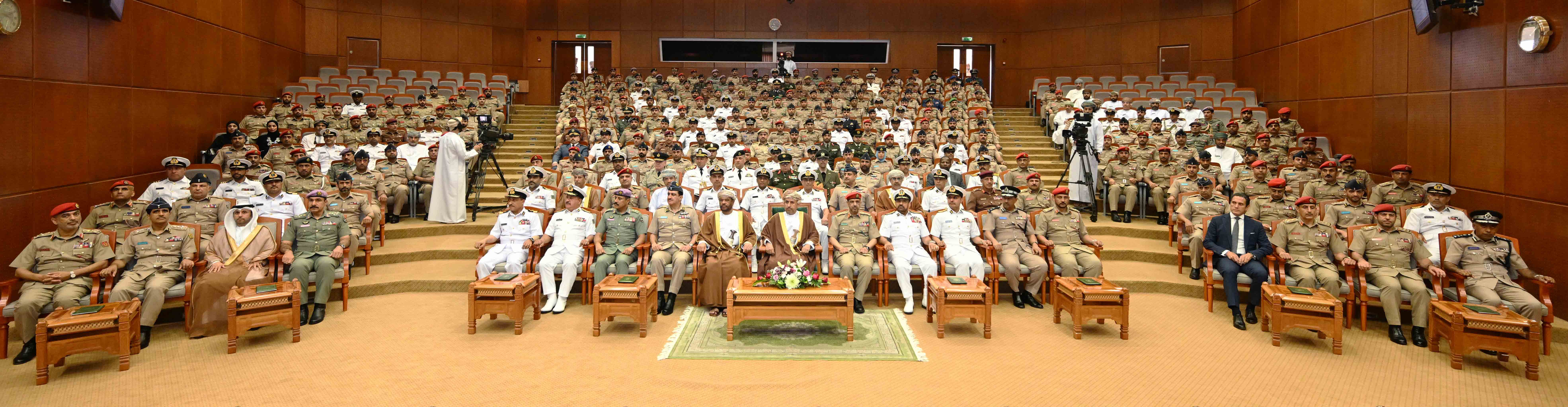 وألقى العميد الركن محمد بن أحمد المشيخي آمر كلية القيادة والأركان المشتركة كلمة رحب فيها بالحضور، ثم قال فيها مخاطبا الخريجين: "في هذا اليوم تصطف فيه القيم العسكرية إلى جوار ركائز الفكر، وفي مناسبة تسطرها الإرادة، وتحتفي بها المؤسسات، نقف أمام إنجاز وطني في رحاب كلية القيادة والأركان المشتركة، التي لم تنشأ لتكون مجرد منارة للعلوم العسكرية فحسب، بل بوابة فكرية تؤسس لما بعدها نحو آفاق المستقبل، نقف هنا اليوم في هذا الصرح التعليمي الشامخ الذي يعد بحق مركزا للتحول القيادي والفكري، ومصنع قادة يتجاوزون المهنة إلى الرسالة، حيث تلتقي صلابة العقيدة العسكرية برحابة الفكر الوطني تحت ظل القيادة السامية لحضرة صاحب الجلالة السلطان هيثم بن طارق المعظم القائد الأعلى حفظه الله ورعاه، الذي أرسى دعائم النهضة المتجددة، في مرحلة يقود فيها الوعي القرار، وتخوض فيها المؤسسات معركة التفوق والتقدم والازدهار".
