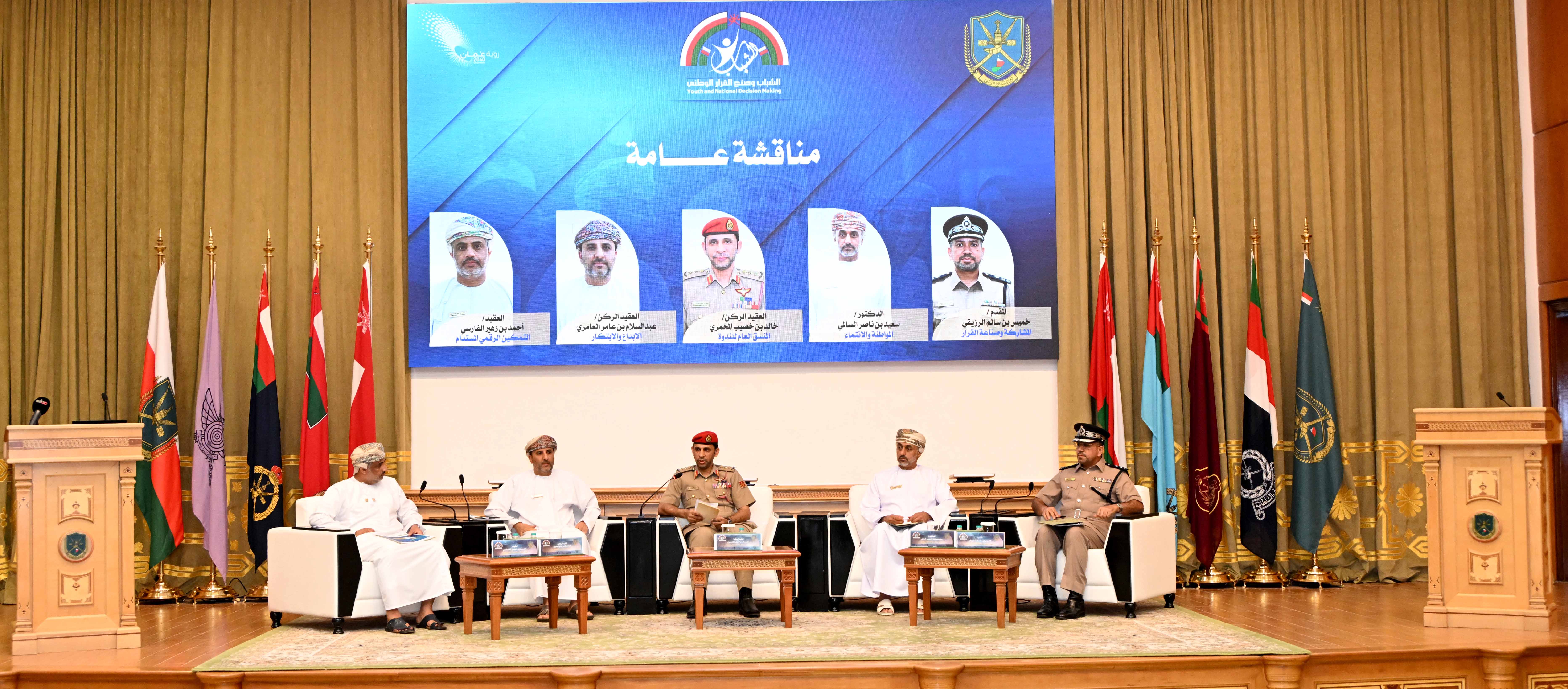 وألقى اللواء الركن بحري علي بن عبدالله الشيدي آمر كلية الدفاع الوطني كلمة قال فيها: " إن تمكين الشباب العماني وإشراكهم في صنع القرار سيسهم في إطلاق طاقاتهم الإبداعية والابتكارية، وتسخير قدراتهم في تقديم حلول عملية ومبادرات مبتكرة تعزز التنمية الوطنية المستدامة وتدعم مسارات التنويع الاقتصادي، وتواكب توجهات التحول الرقمي والاقتصاد المعرفي وتطبيقات الذكاء الاصطناعي بما يعزز تنافسية الاقتصاد الوطني.
